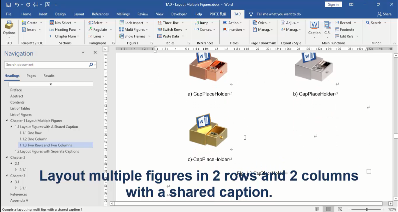Layout multiple figures with a shared caption or with separate captions