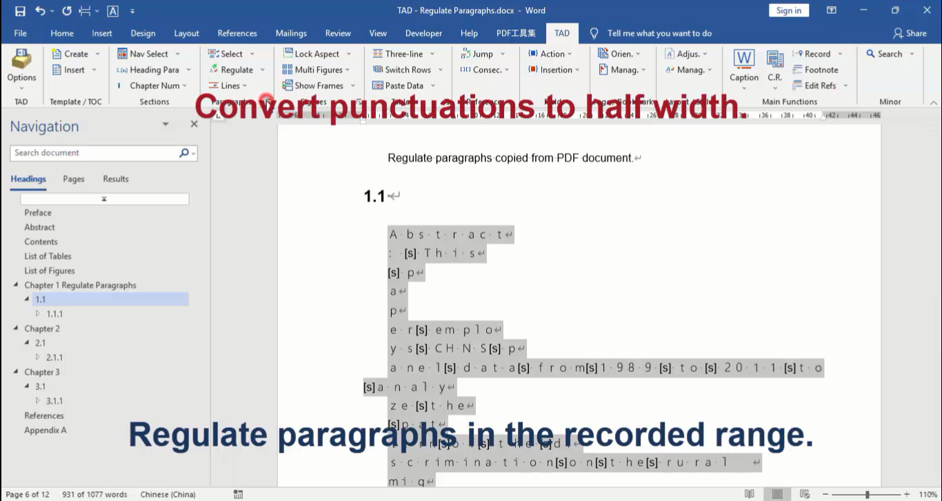 Regulate the paragraphs copied from a scanned PDF document, such as deleting spaces, deleting empty paragraphs, converting punctuations/alphanumerics to half/full width, replacing the custom break mark with the paragraph break.